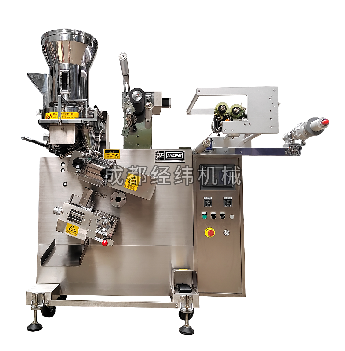 該機主要適用于粉末、顆粒物料自動填充包裝,物料通過計量盤裝置的精確計量后直接落入包裝袋中,采用單組熱封輥筒的封合方式,進行三邊封口,封口花紋采用完整、連續的棋盤紋,封口穩定可靠。