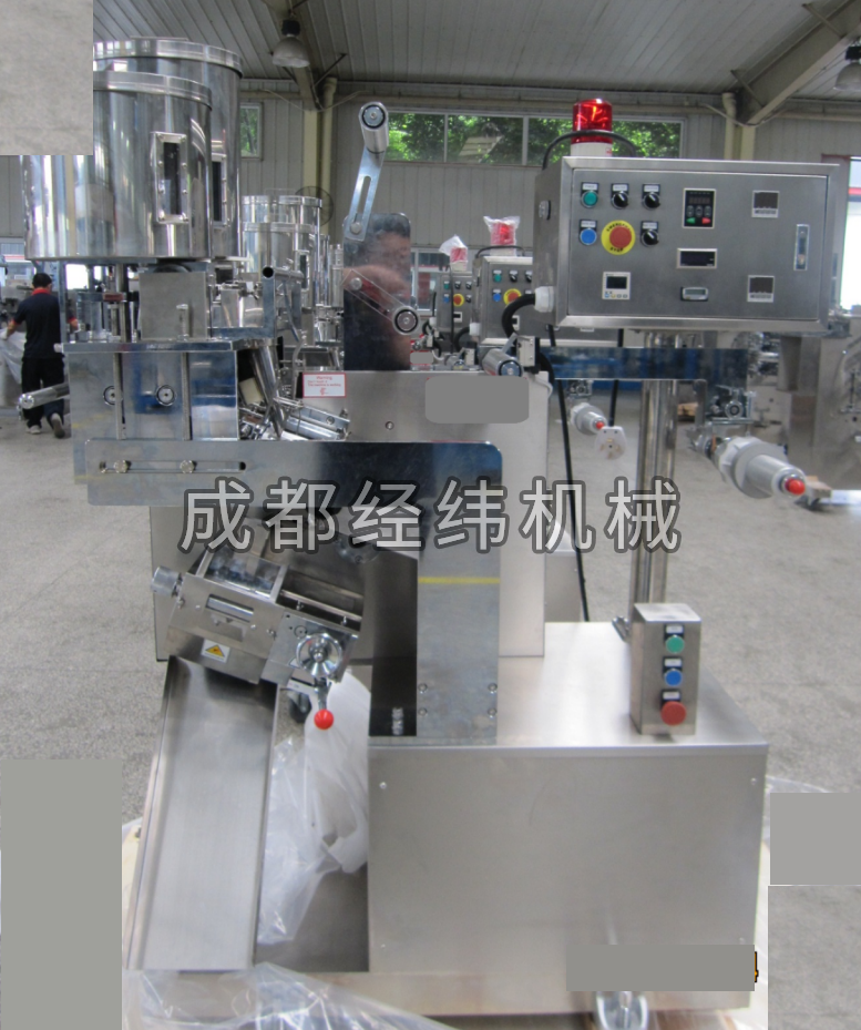 該機(jī)主要適用于粉末、顆粒物料雙列自動(dòng)填充包裝,物料通過計(jì)量盤裝置的精確計(jì)量后直接落入包裝袋中,采用單組熱封輥筒的封合方式,進(jìn)行三邊+四邊封口,封口花紋采用完整、連續(xù)的棋盤紋,封口穩(wěn)定可靠。